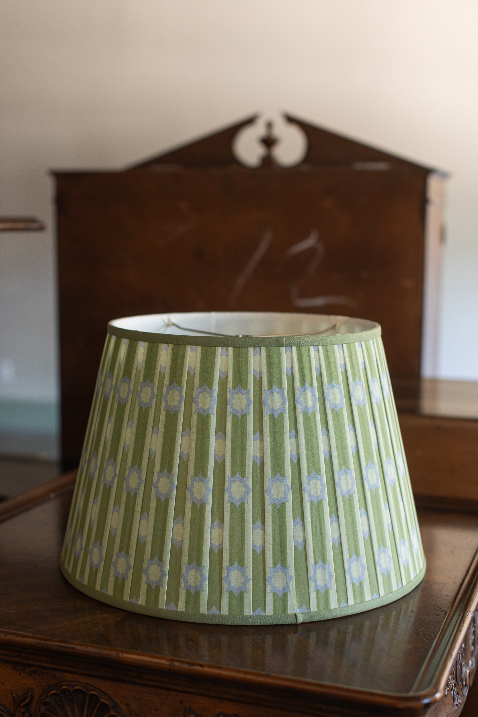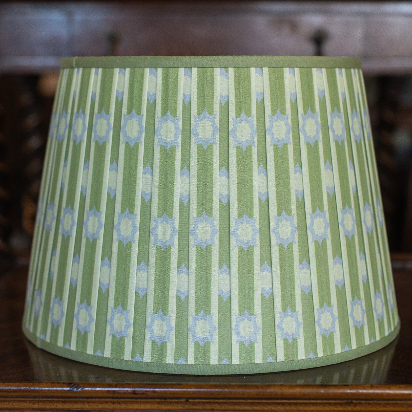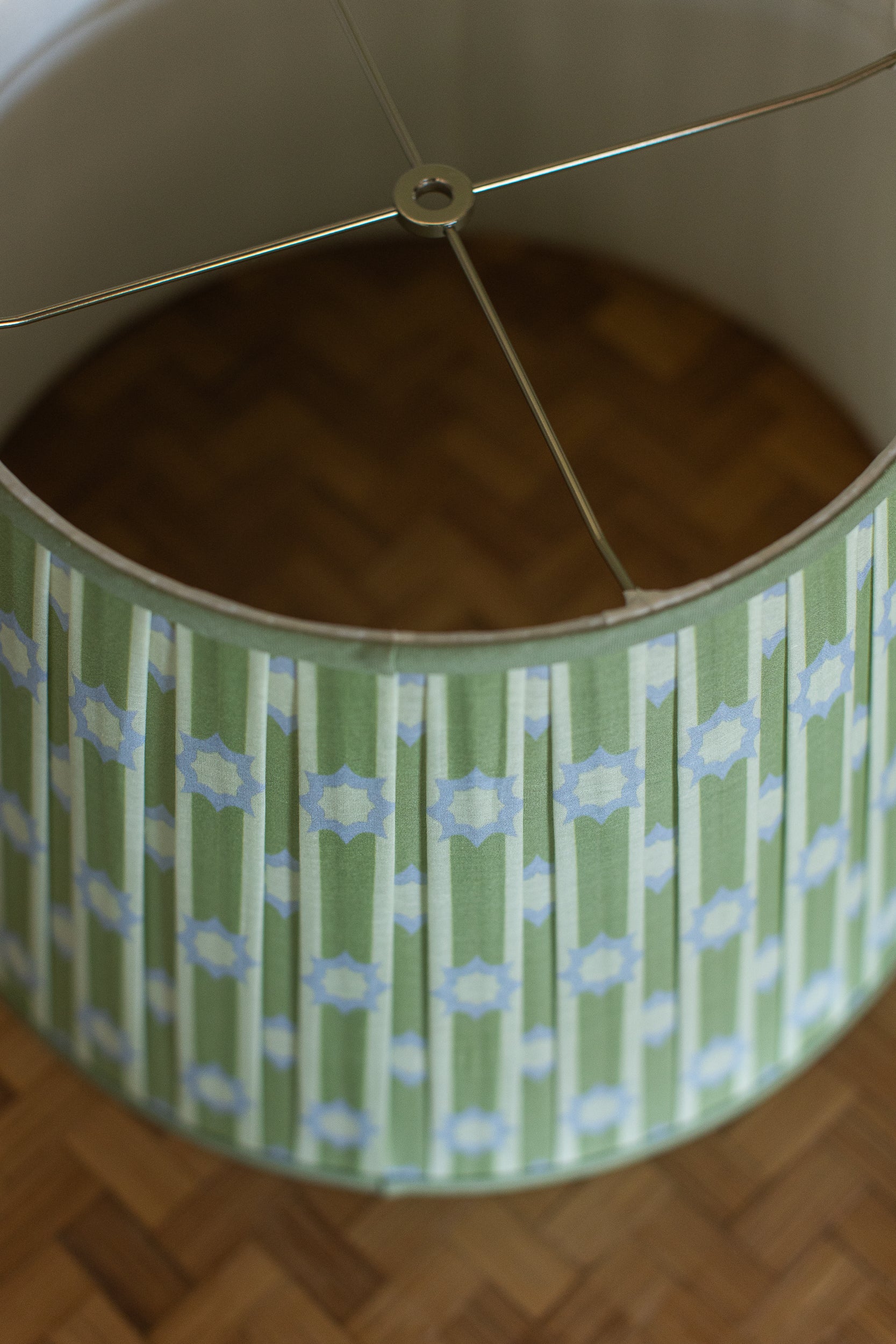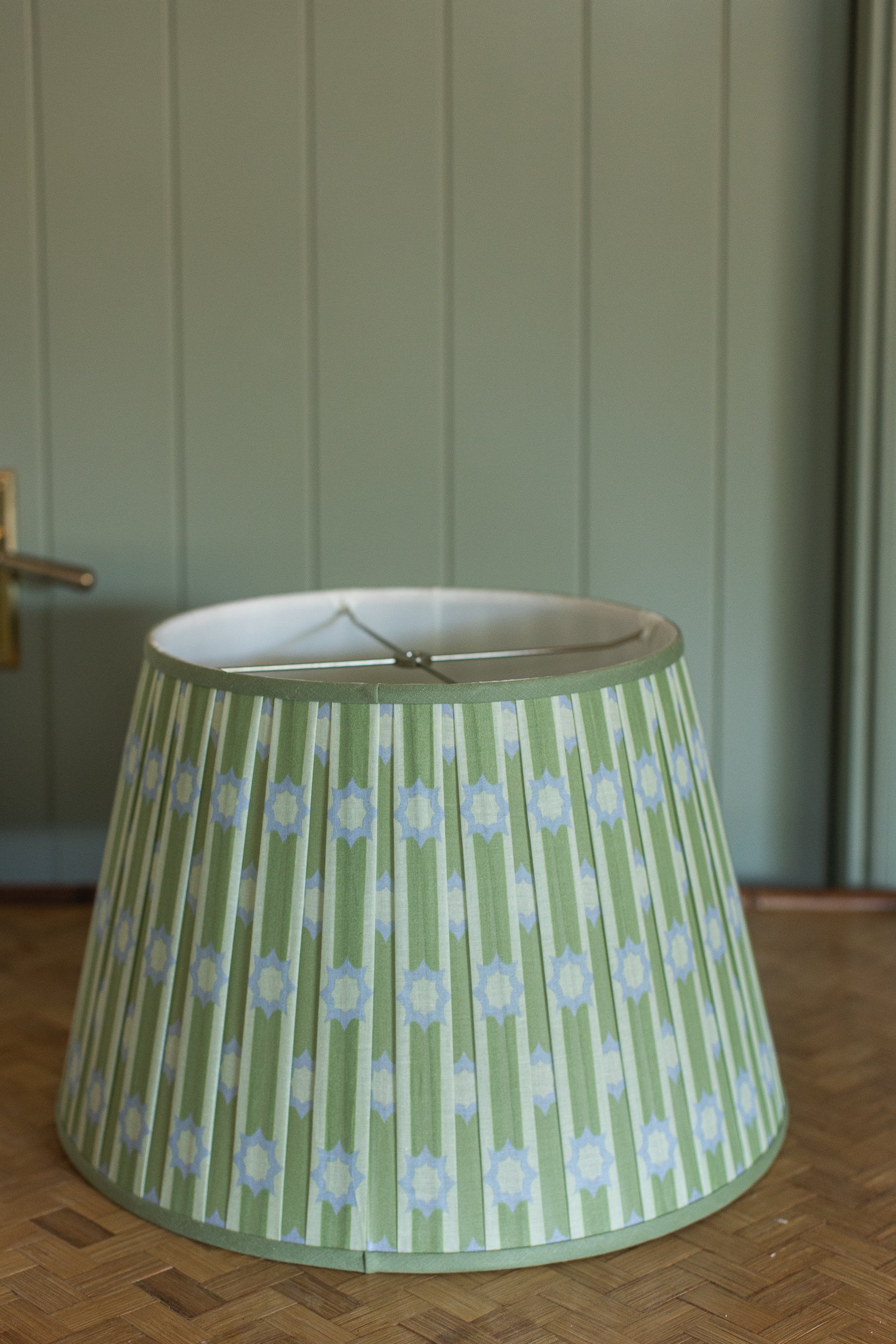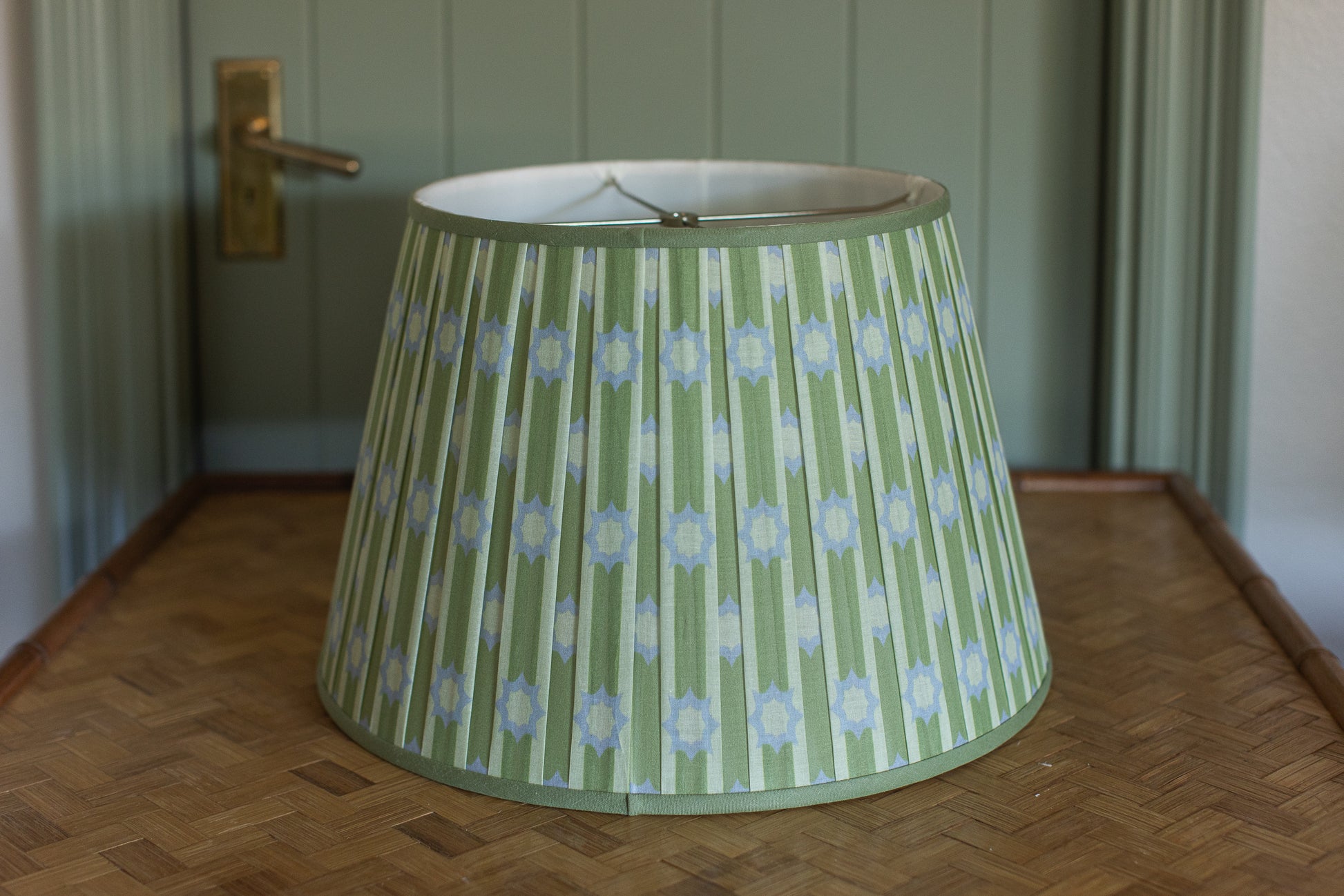 A little bit midcentury, a little bit garden folly—this pleated lampshade plays the pattern game just right. Dressed in fresh celadon green with pale periwinkle starbursts, it’s a cheerful update to classic shapes, offering just the right amount of whimsy without wandering into kitsch. Perfect for a study that loves a pop of personality or a sunroom that leans timeless with a wink.