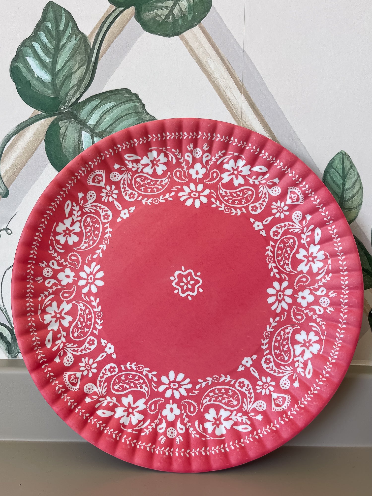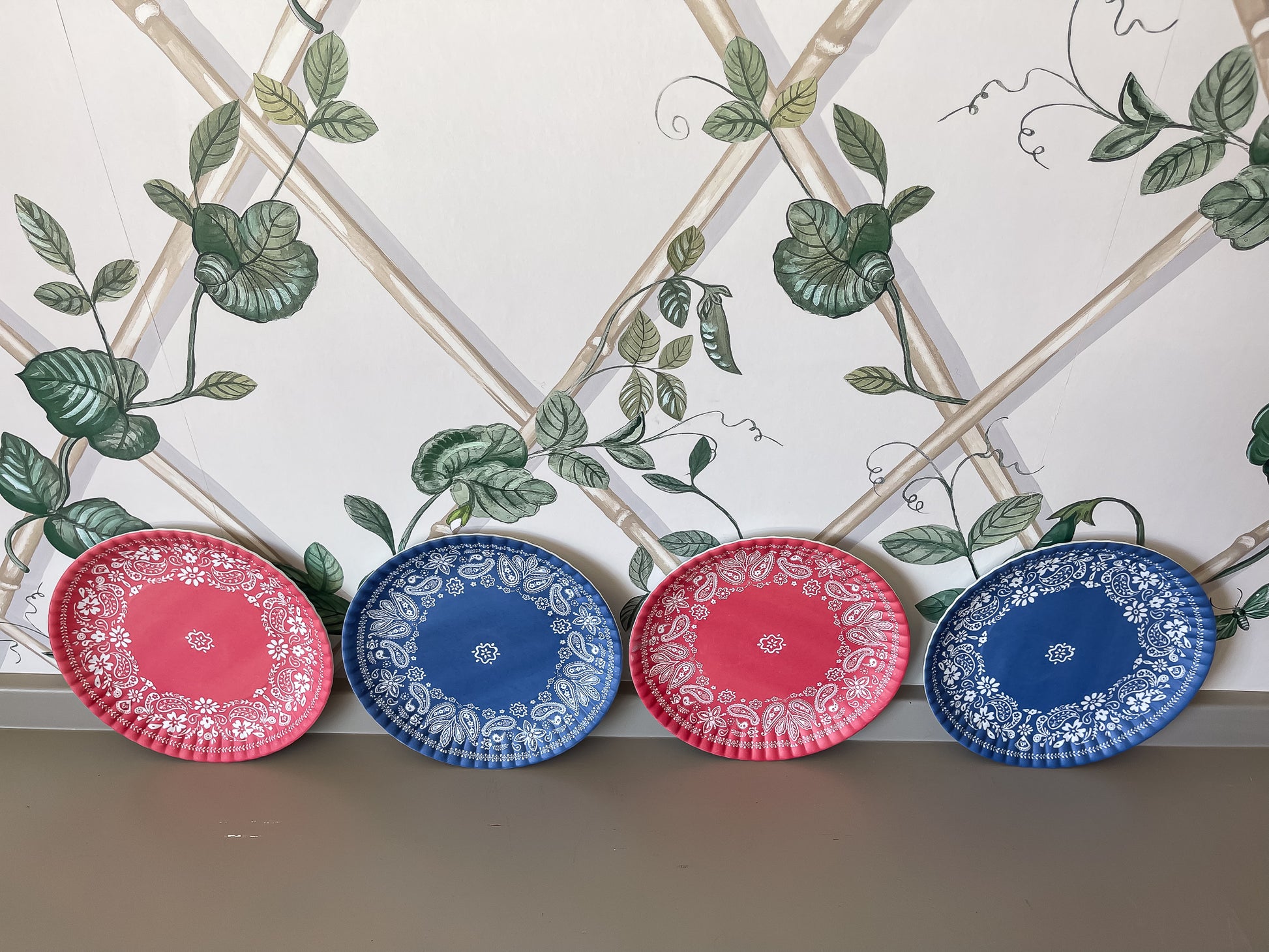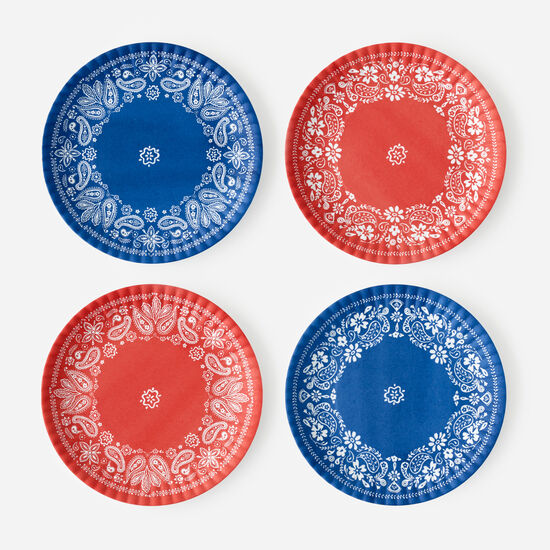 This set of 4 melamine plates has a bandana pattern, perfect for your next picnic brunch or Fourth of July gathering. Melamine is a durable, lightweight material that is shatter-proof and easily cleaned, making it ideal for both indoor and outdoor use.