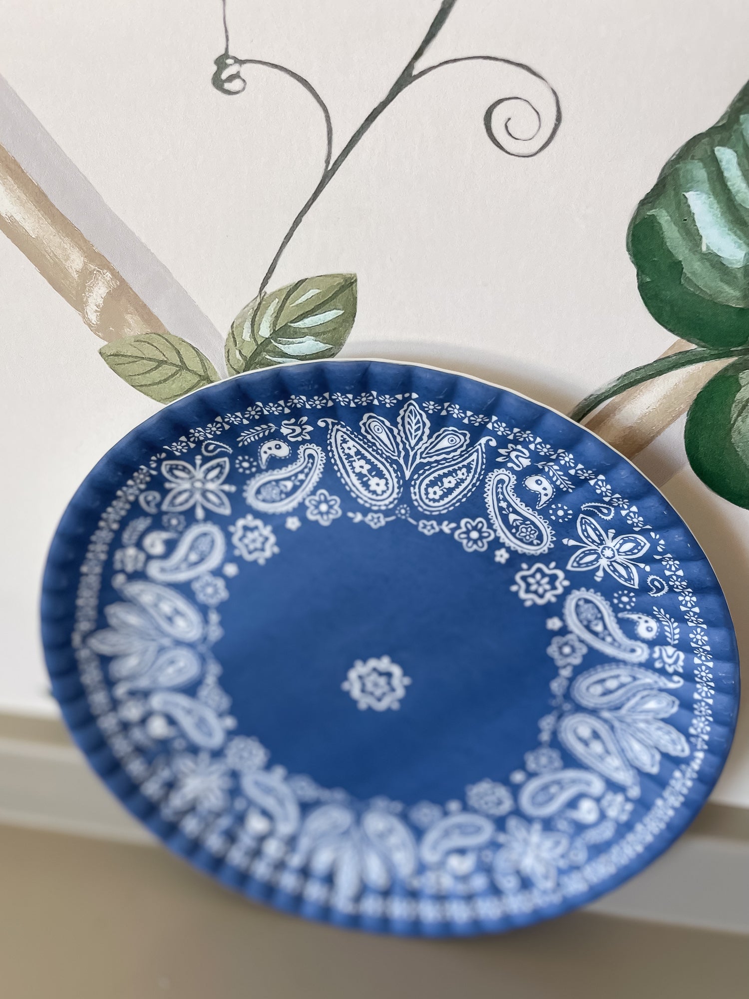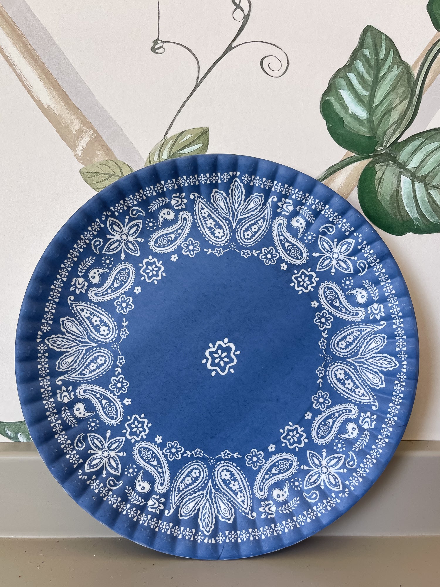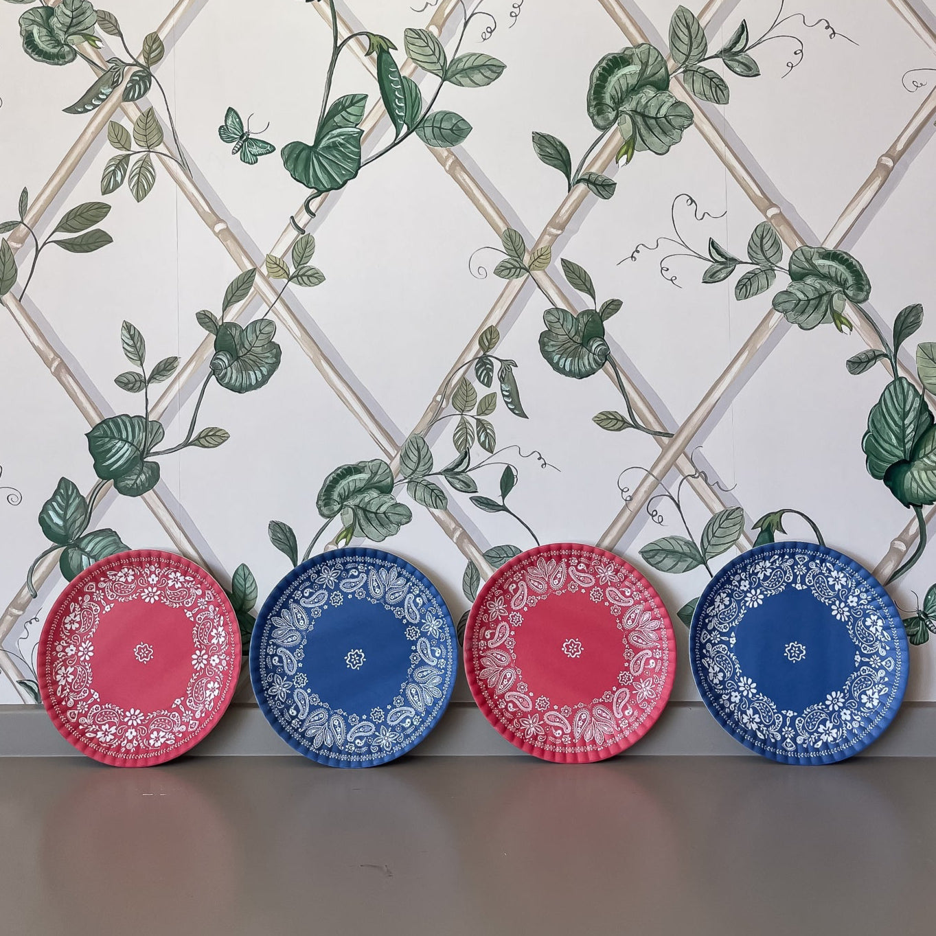 This set of 4 melamine plates has a bandana pattern, perfect for your next picnic brunch or Fourth of July gathering. Melamine is a durable, lightweight material that is shatter-proof and easily cleaned, making it ideal for both indoor and outdoor use.
