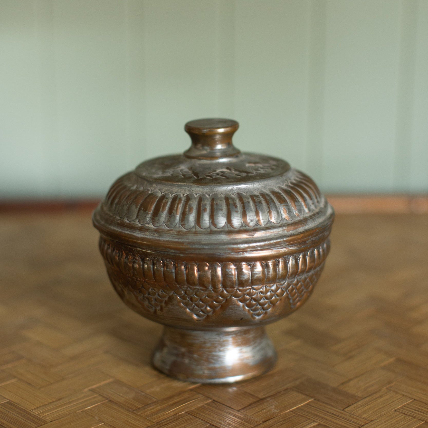 A beautifully aged hand-hammered brass bowl with lid, featuring intricate repoussé detailing and a raised pedestal base. The lid is topped with a simple knob and echoing the scalloped motifs seen around the body. With its rich patina and classical form, this piece lends a timeless elegance to a tabletop, entry console, or shelf. Ideal for storing trinkets or simply admired as a decorative object with old-world charm.