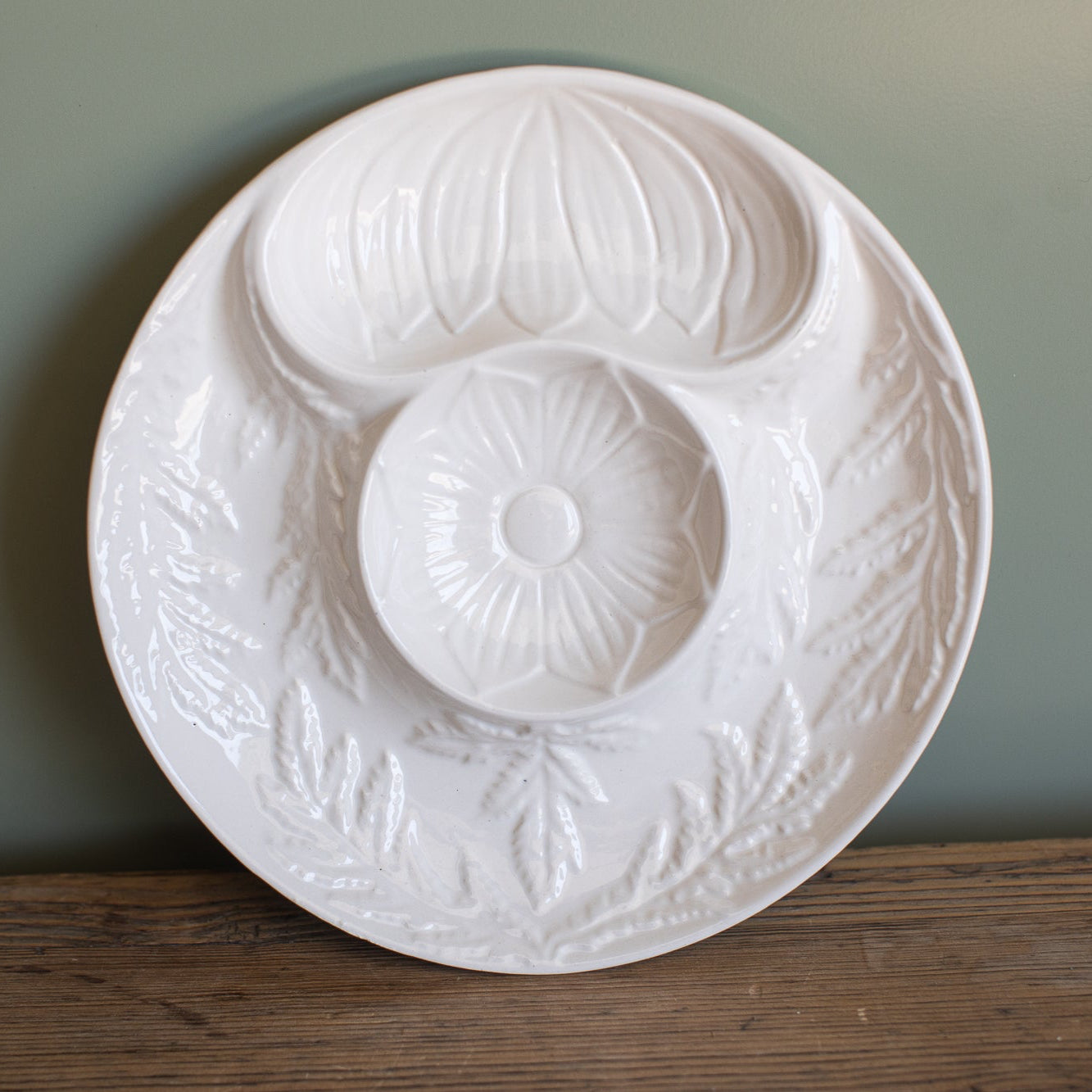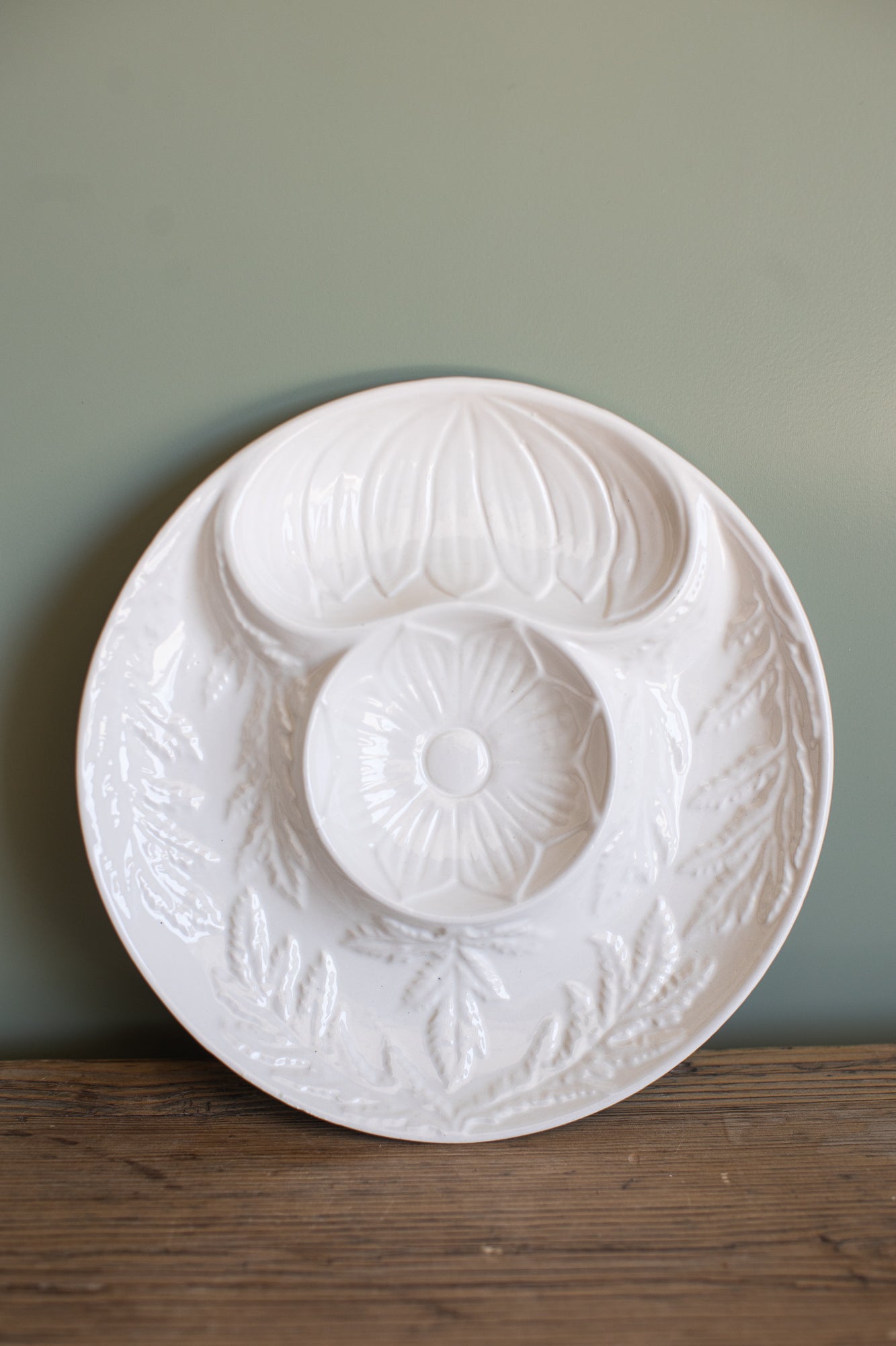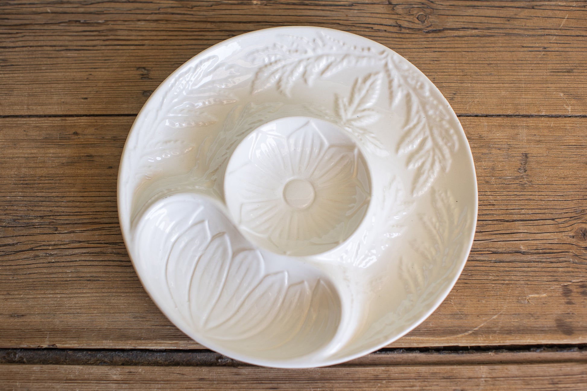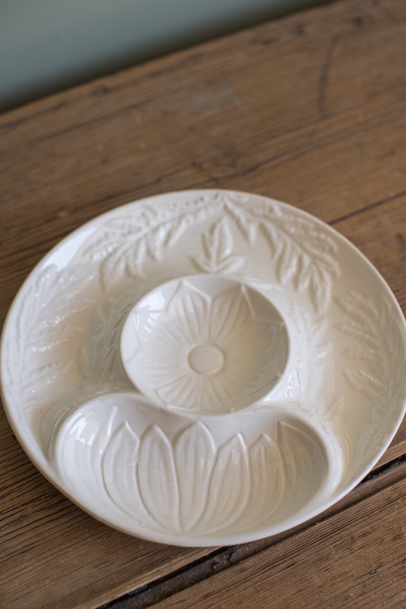 This lovely vintage relish tray features a soft ivory glaze and embossed botanical details, including leaves and a central floral motif. With two curved side wells and a central well, it's perfect for serving olives, dips, or small bites. Marked “CALIF. USA 449” on the underside, indicating mid-century California pottery. A beautiful blend of form and function for vintage kitchenware collectors or entertainers alike.