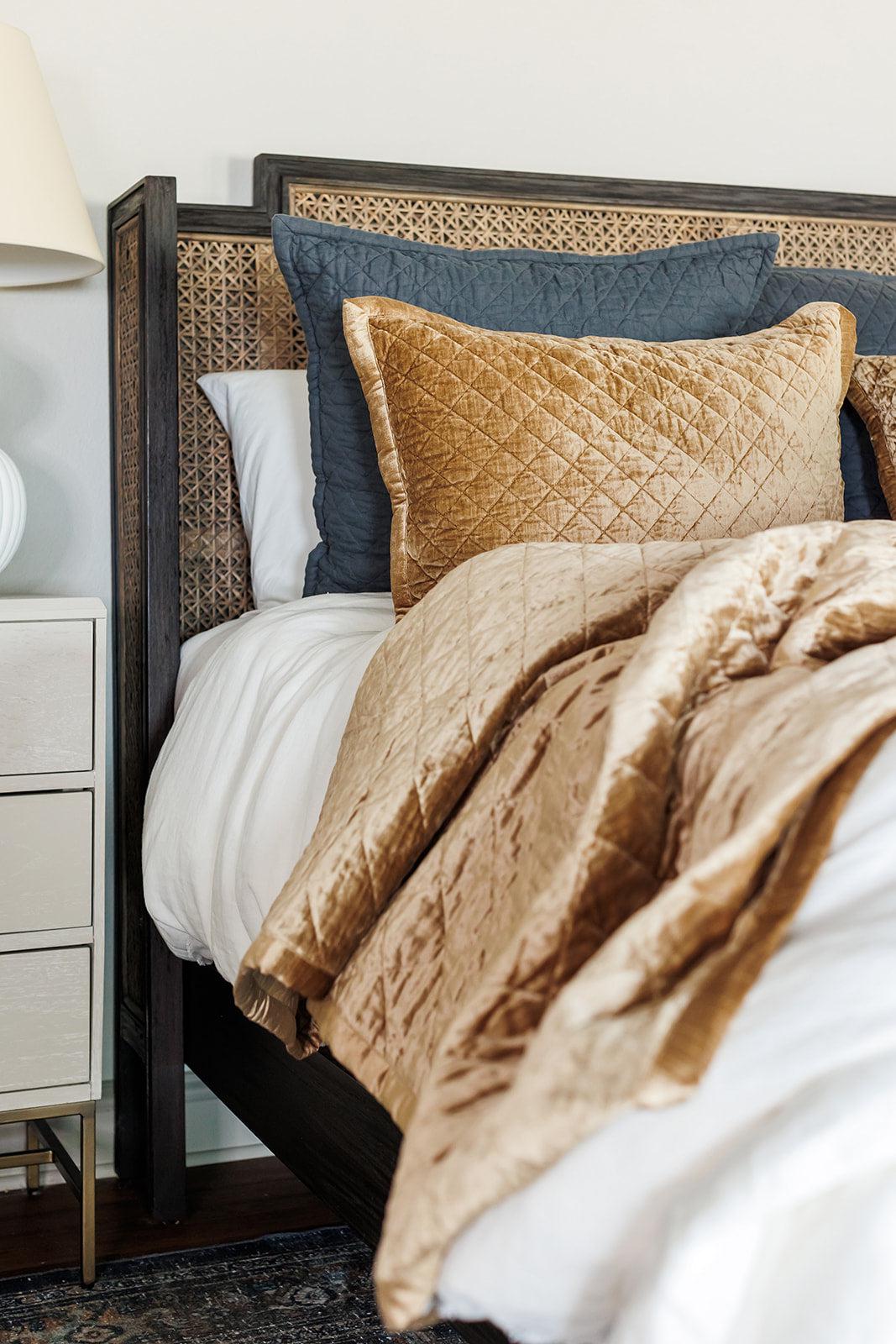 The Quilted Luxe Sham is constructed of a rich rayon velvet, quilted in a classic diamond pattern and bound with self-piping for a formal and lustrous aesthetic. Quilted rayon face and back on pillows. Coordinated Quilted Cotton Backing on Blanket.