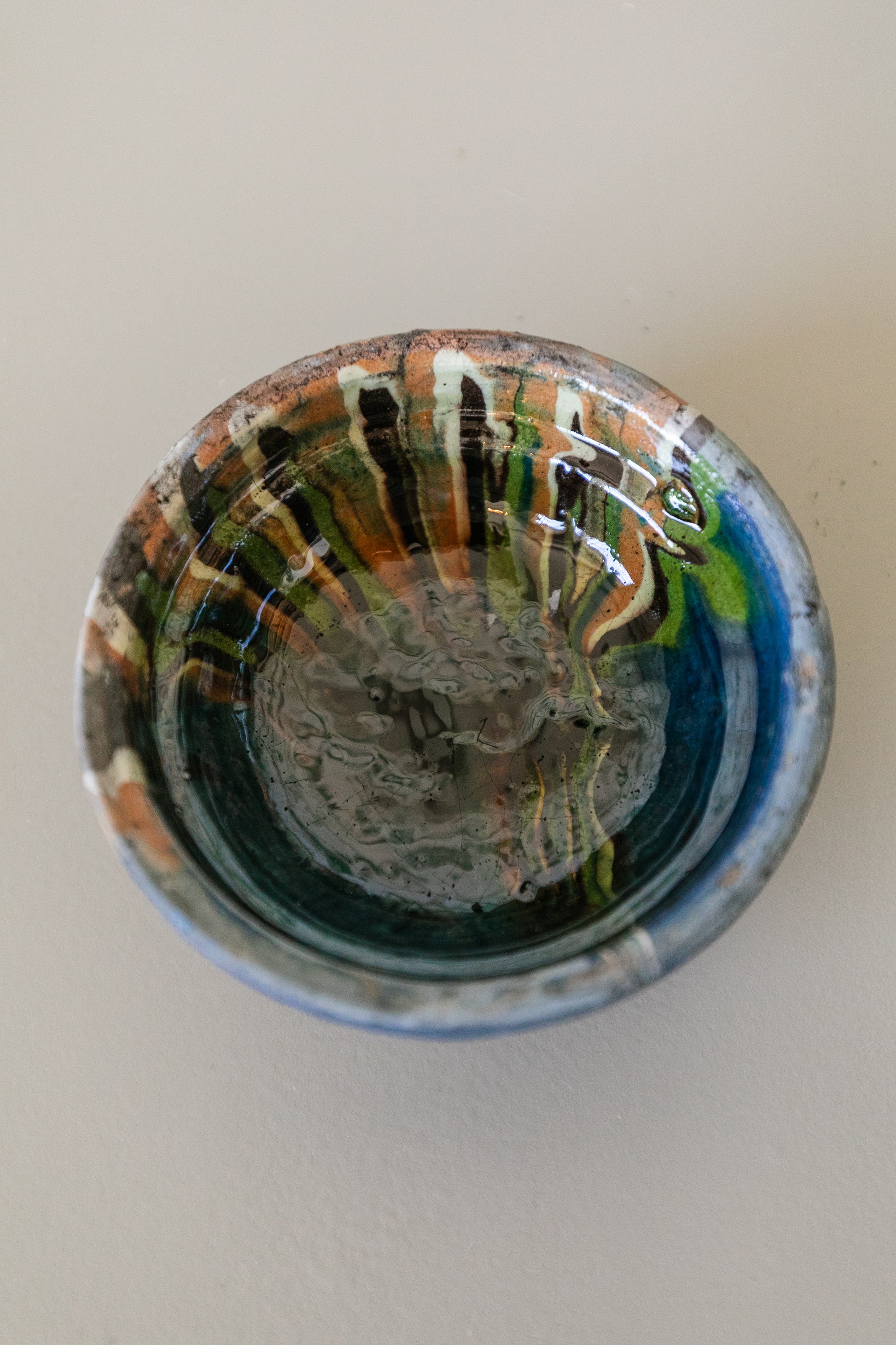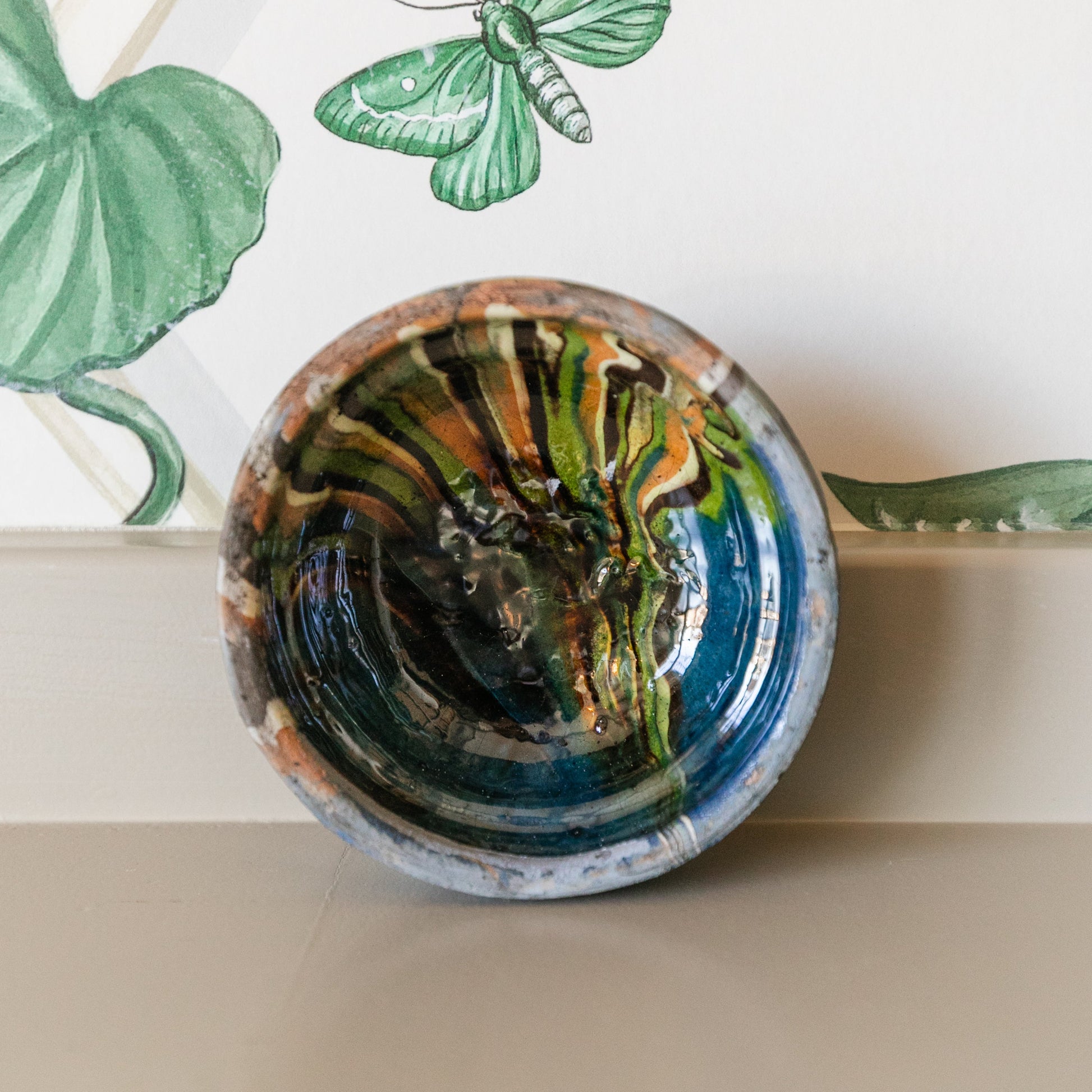 The shallow-basin of the Cottage Crafted Bowl make wistful decorative displays. The bowls have a natural clay finish for the exterior bowl with a wash of color on the interior and outer thick rim of the bowls. The glaze has irregular marbleized color swooshes that make each handmade bowl unique.