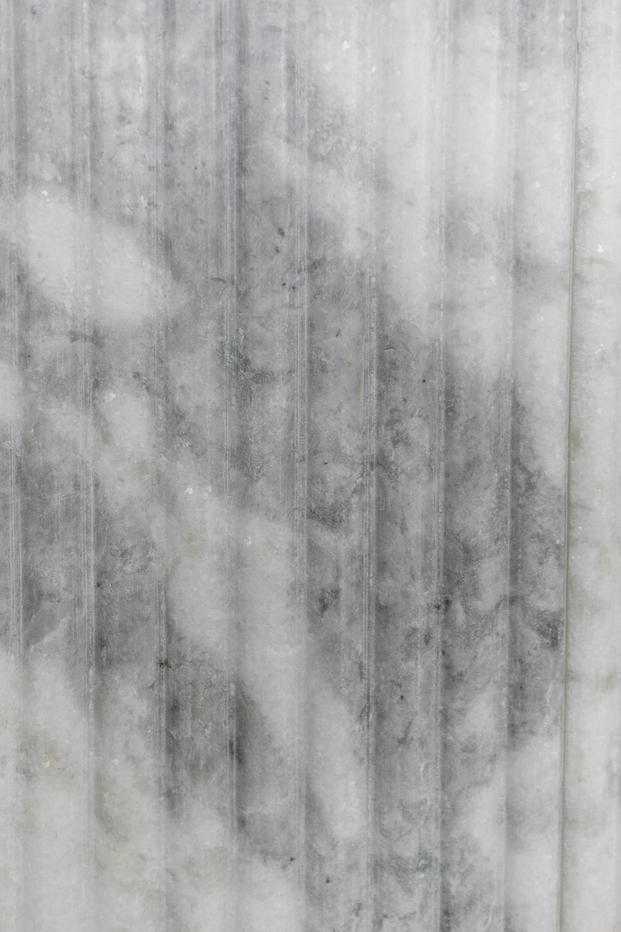 Italian-inspired swirling marble base is scalloped for a linear look with heavy texture. An oval-shaped tabletop of polished white marble seats six comfortably.