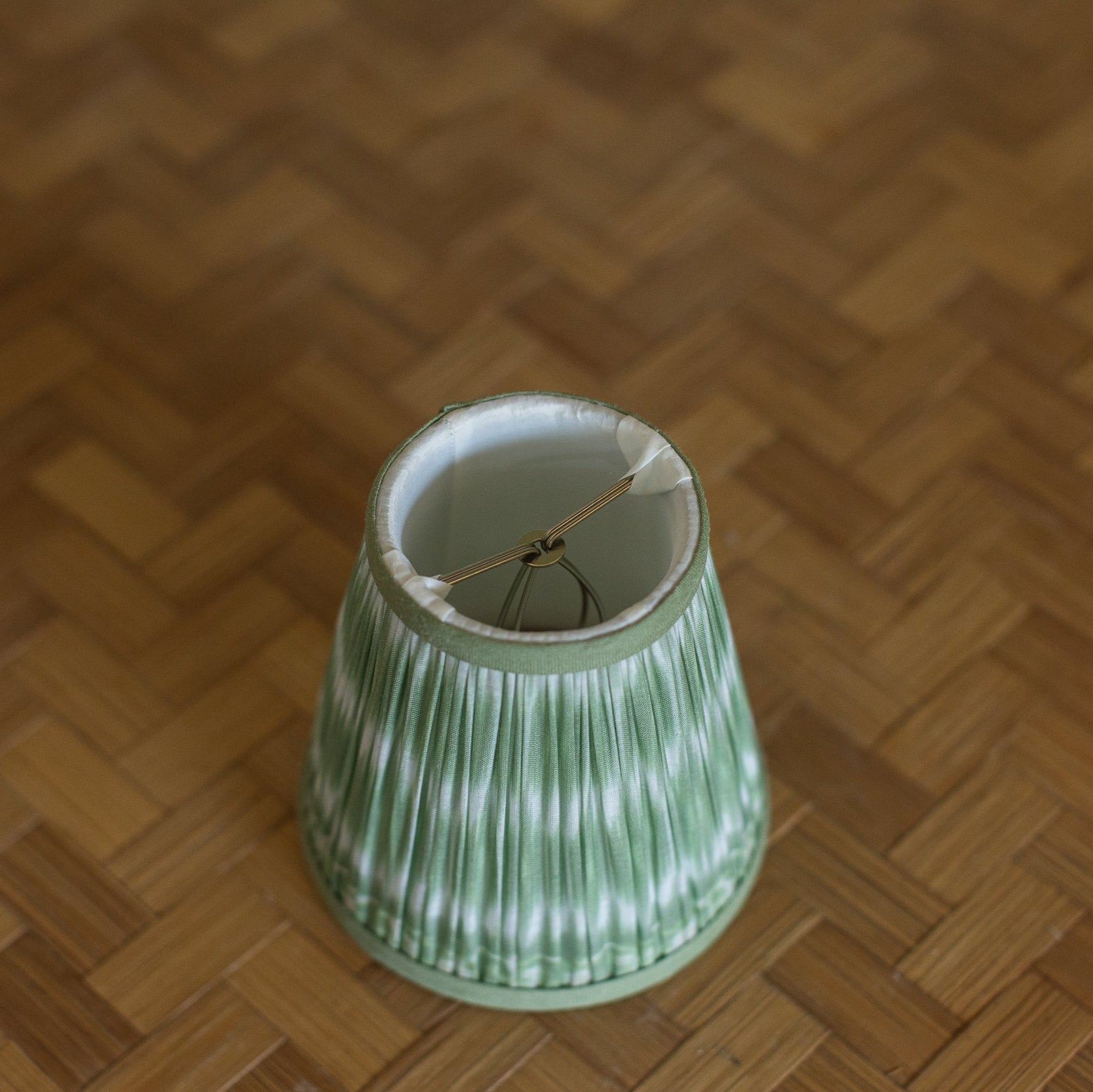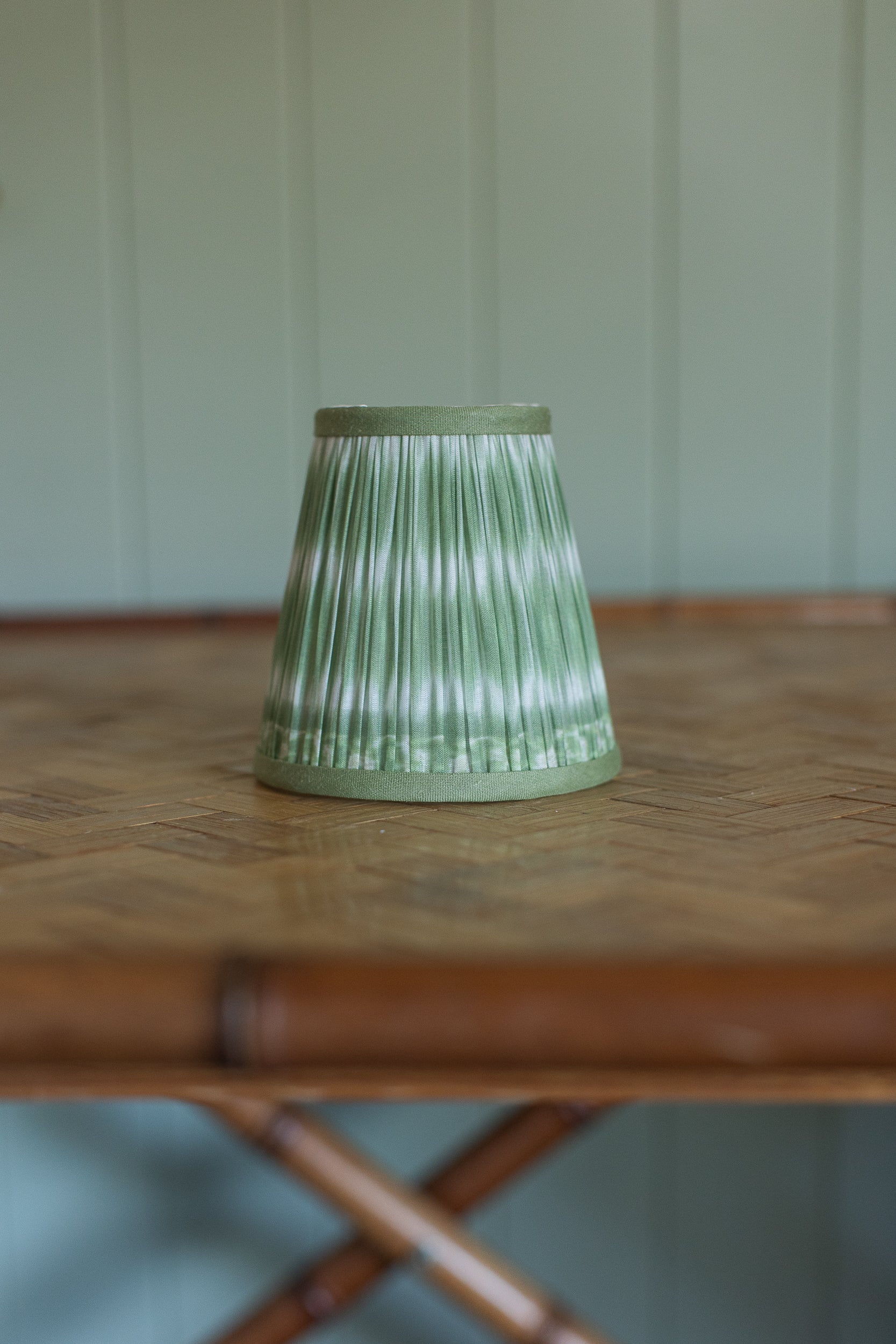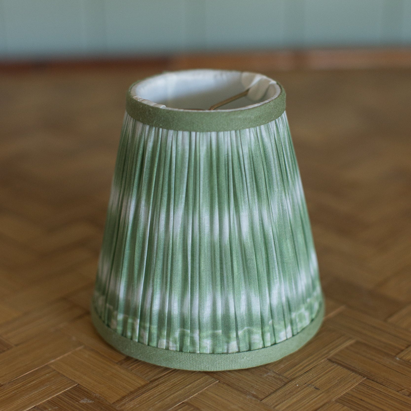 Small in scale, big on charm—this pleated lampshade brings a dash of whimsy with its soft green tie-dye wash. The color feels like spring leaves after rain—fresh, bright, and slightly unexpected. Whether perched on a brass chandelier or topping a tiny ceramic base, it offers just the right note of quiet flair. Proof that even the littlest lights deserve a little drama.