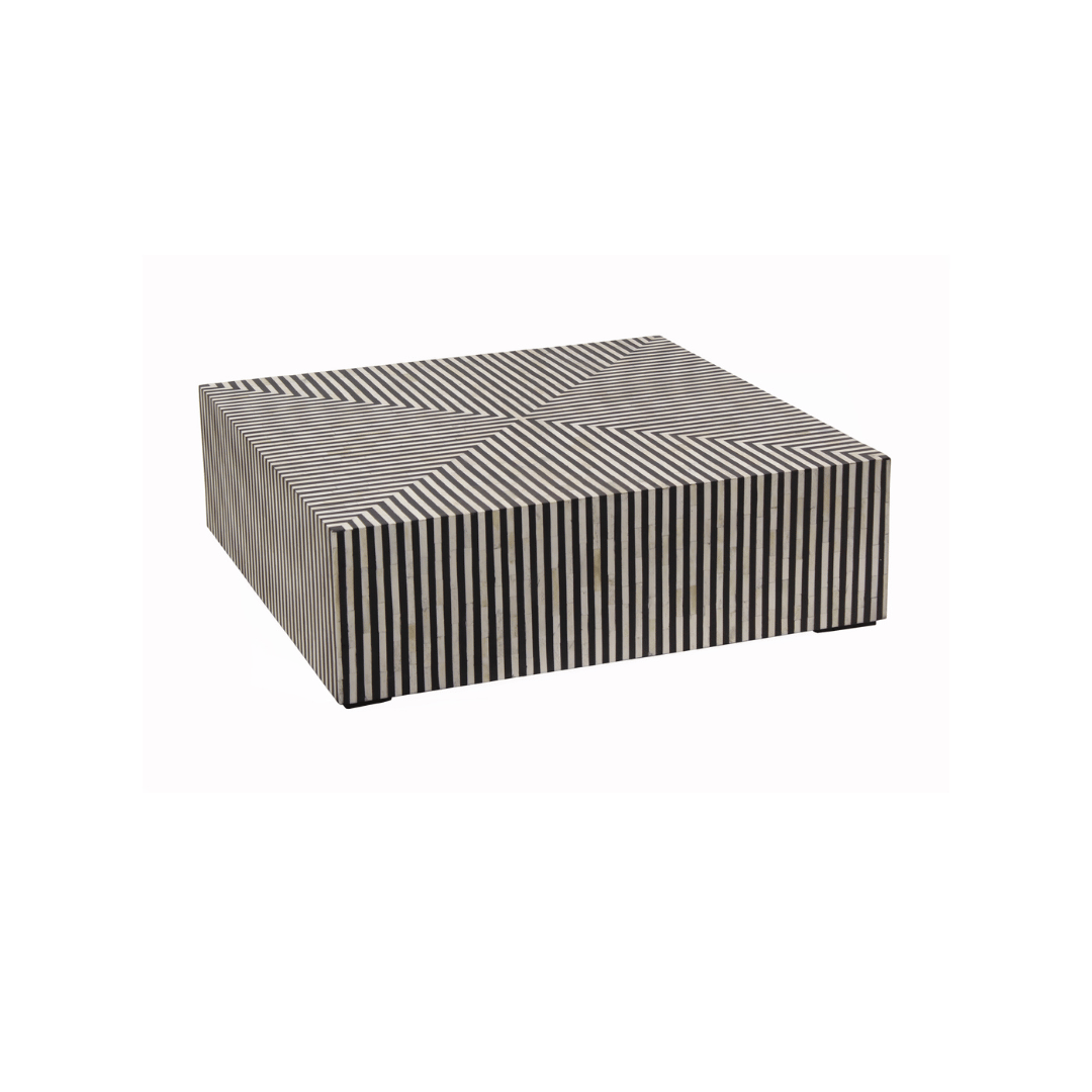 Simplistic and bold, the Jeanette coffee table’s hypnotic art deco design is an exercise in contrast. A veneer of ethically sourced white and black camel bone with resin adds a visual statement that contrasts with its simple construction and square shape.