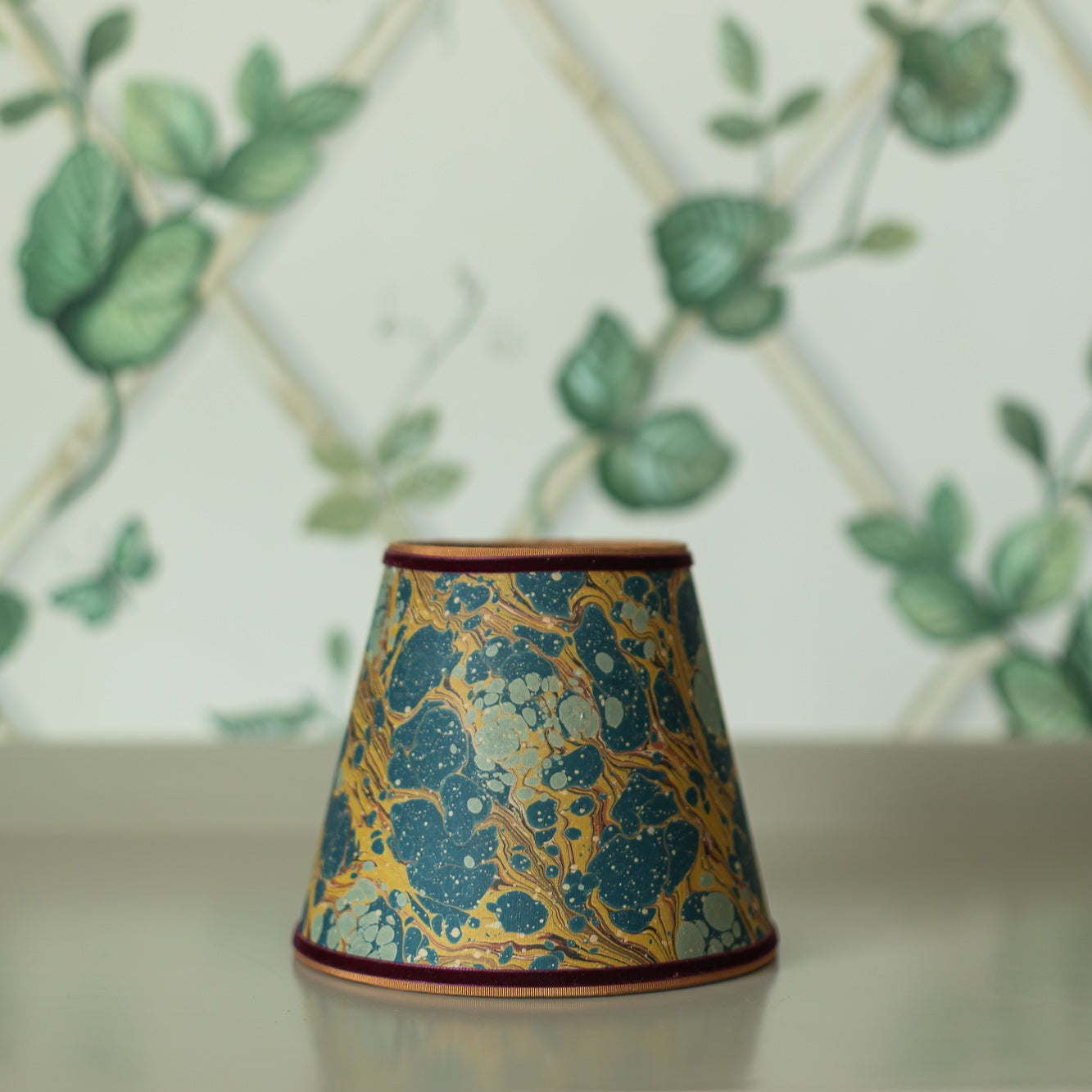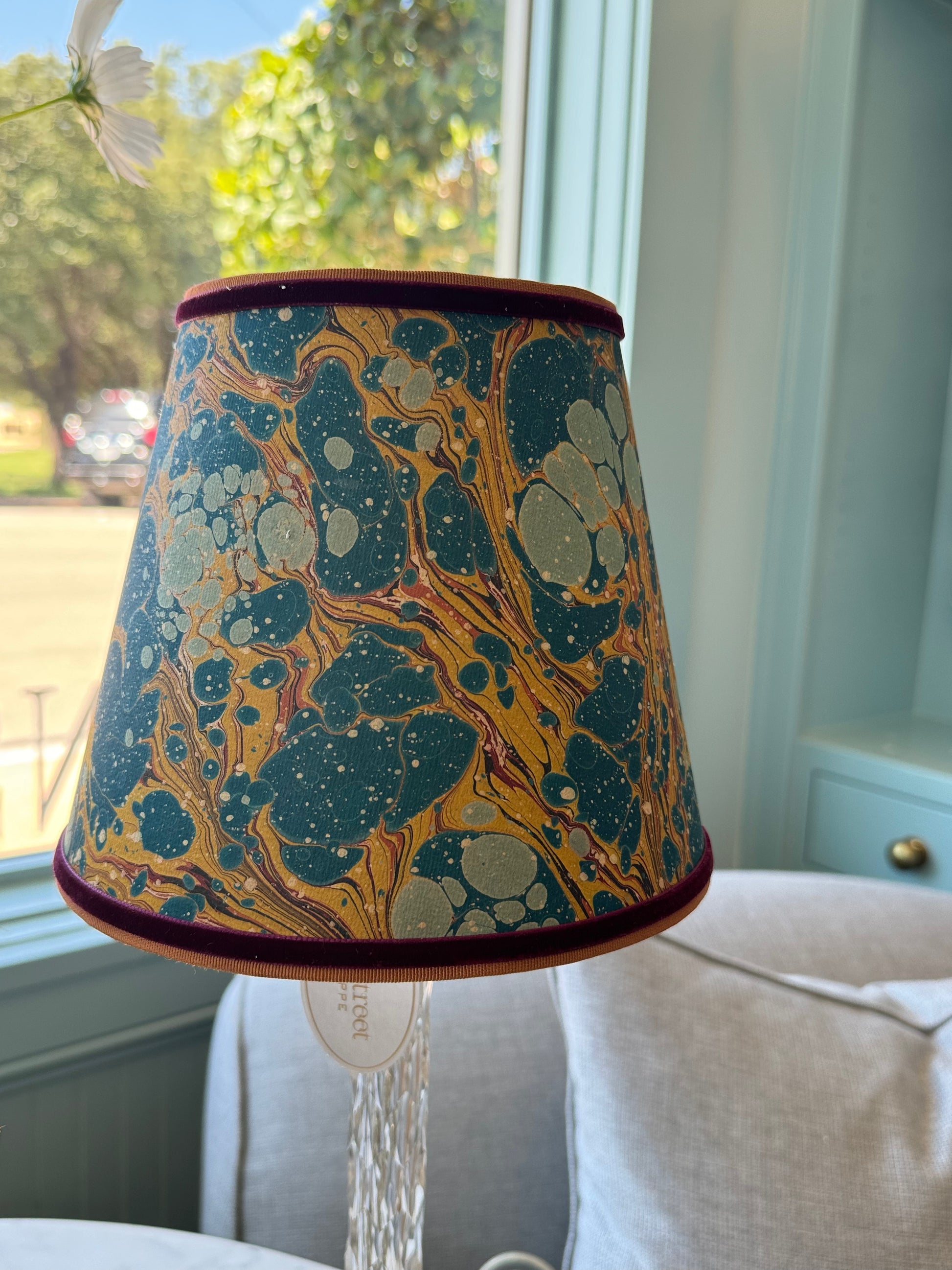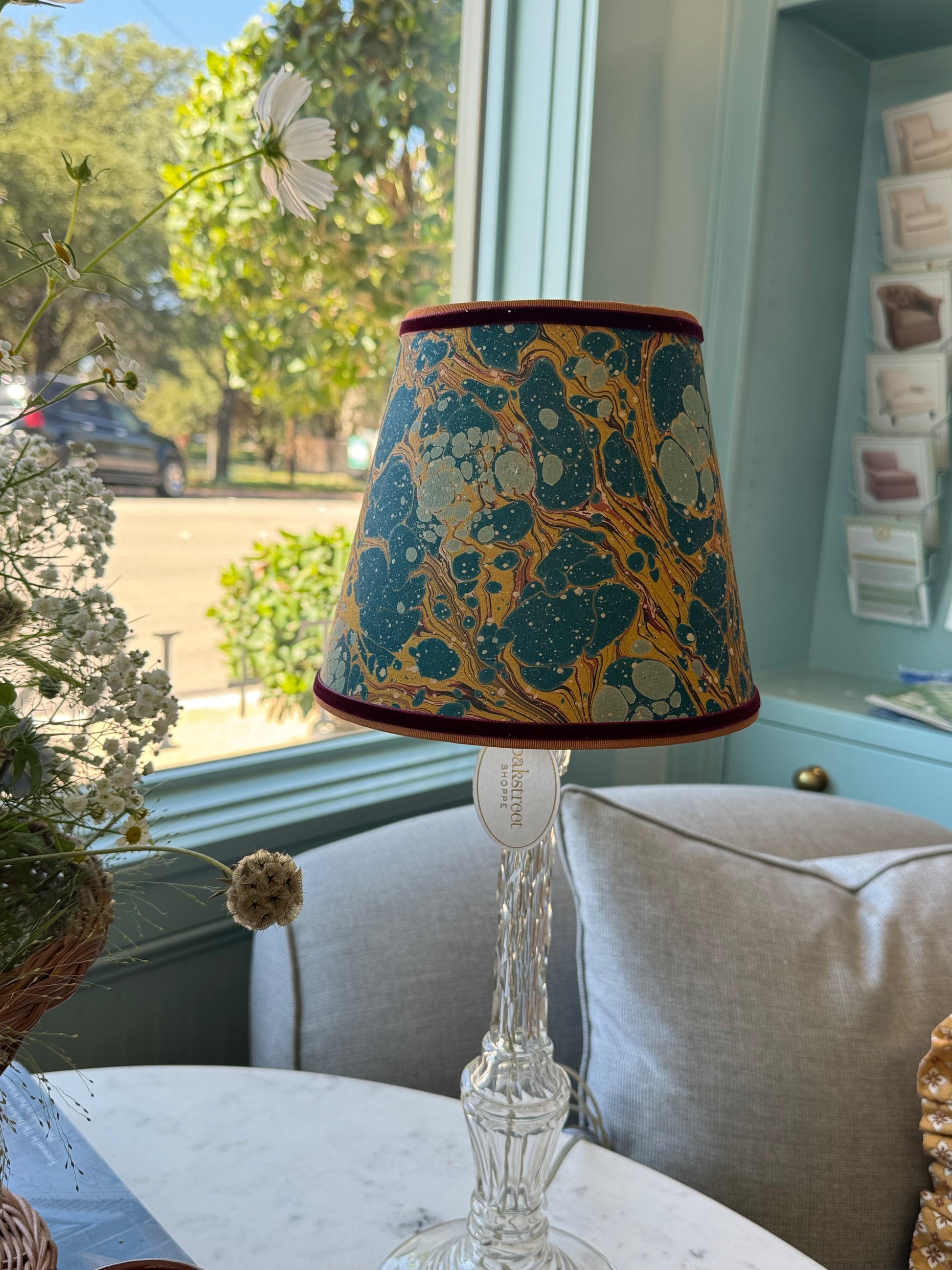 Our marbleized clip shade is the perfect complementary piece for that lamp that needs a touch of fun, color, or interest. Trimmed with a rich burgundy velvet ribbon, this hand-marbled empire shade can clip onto any candleabra or small bulb.