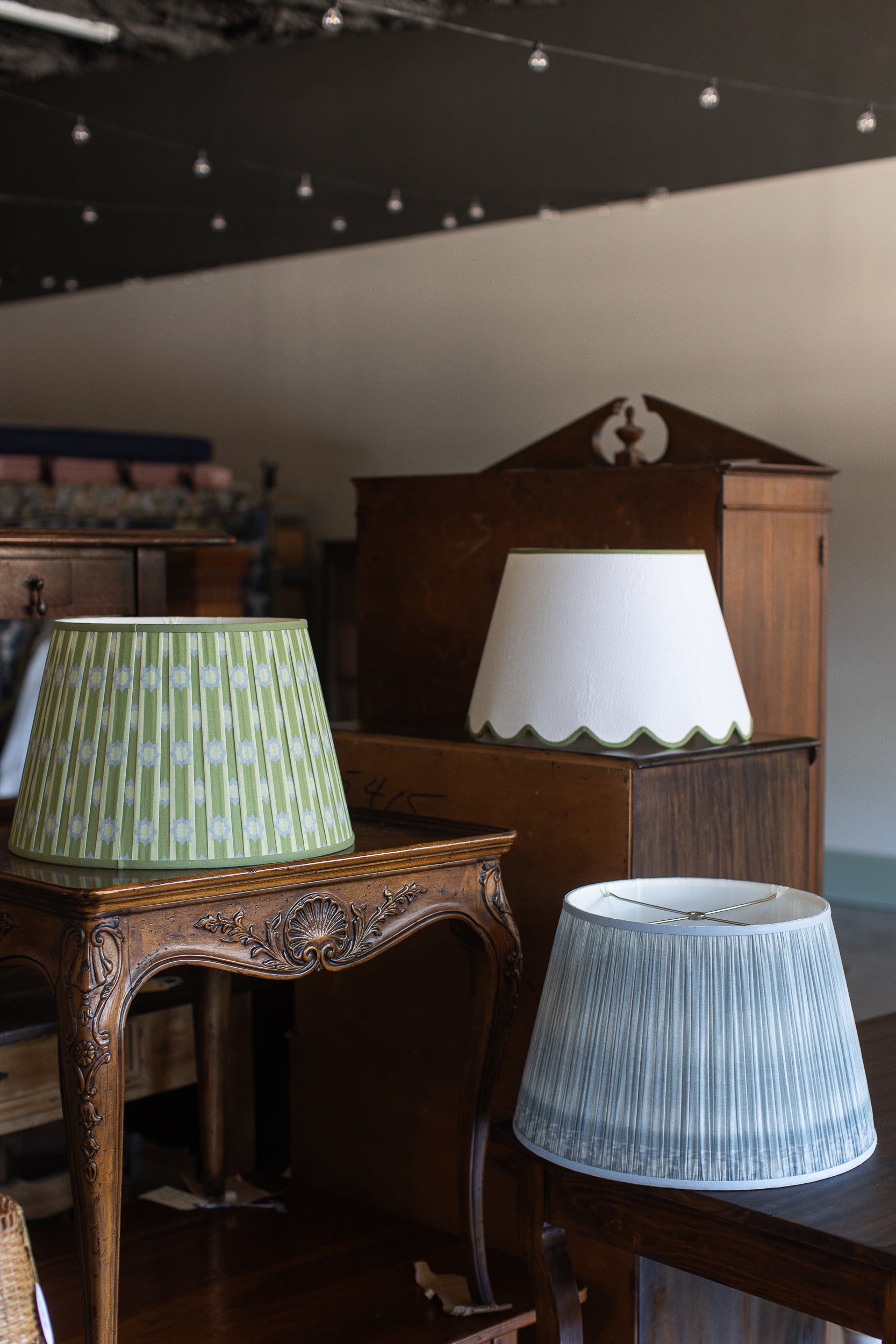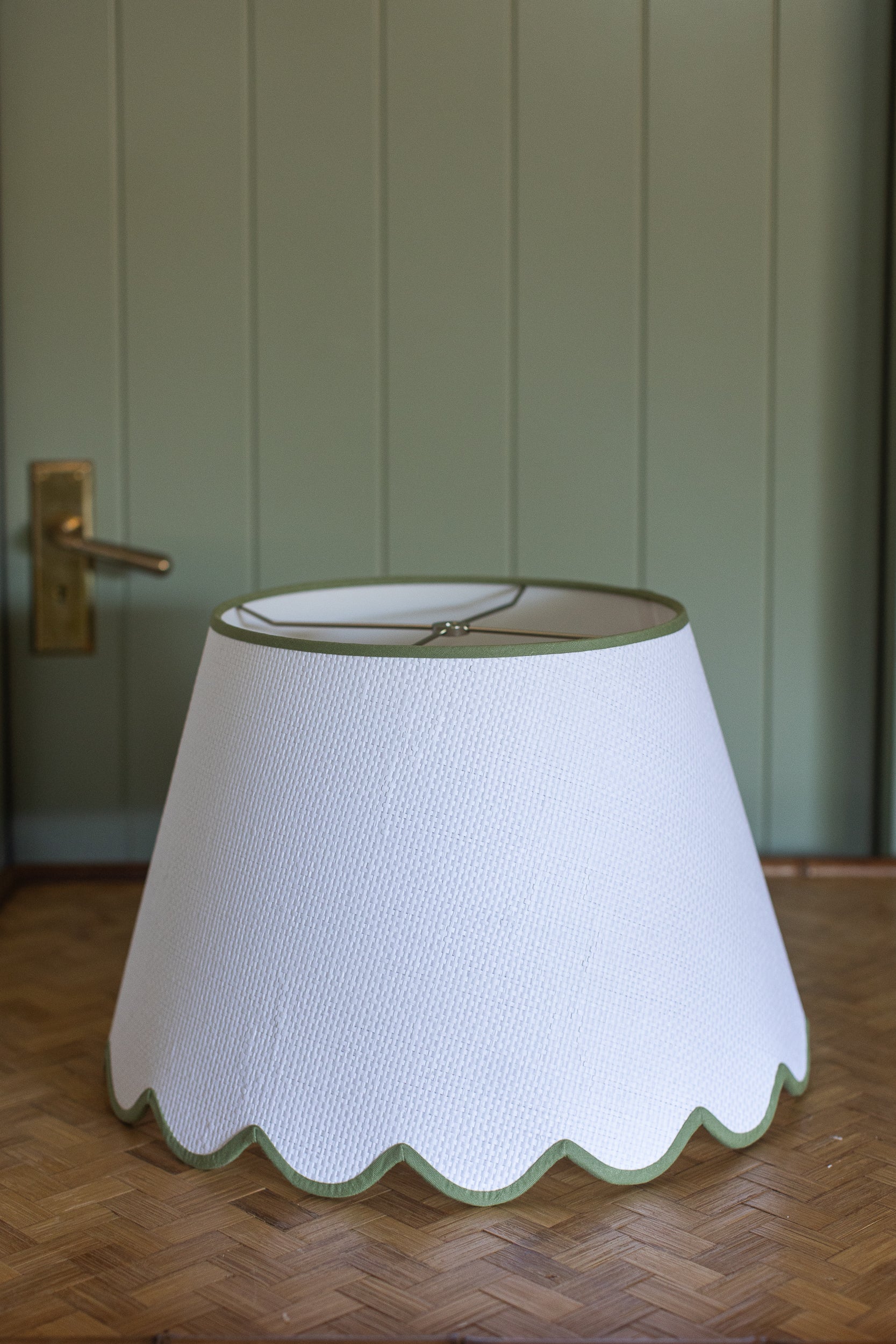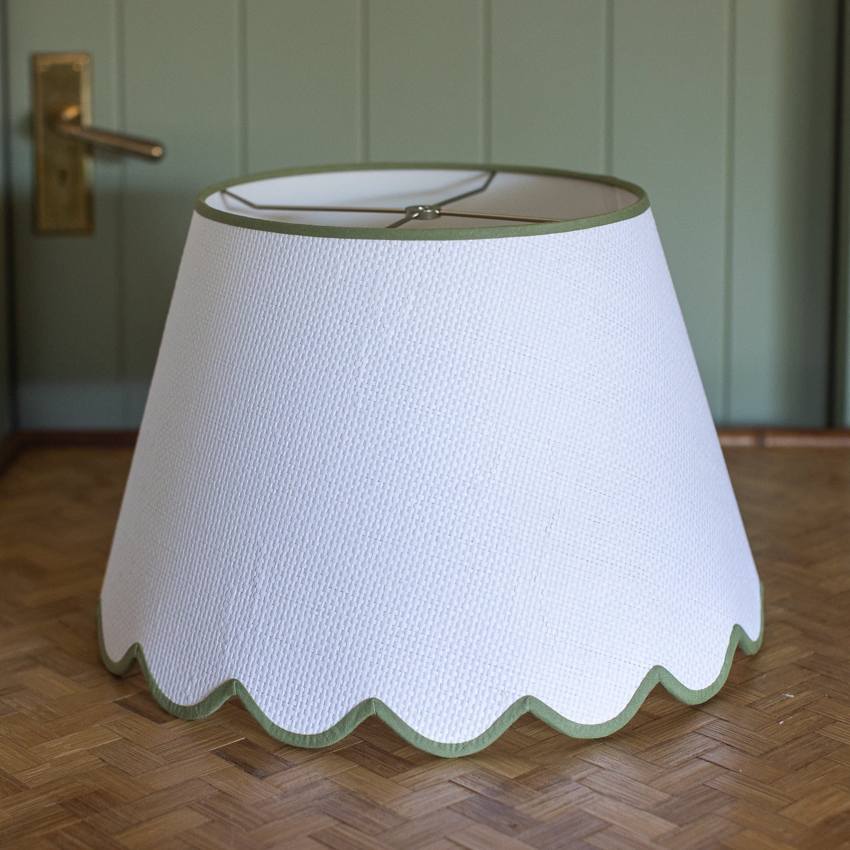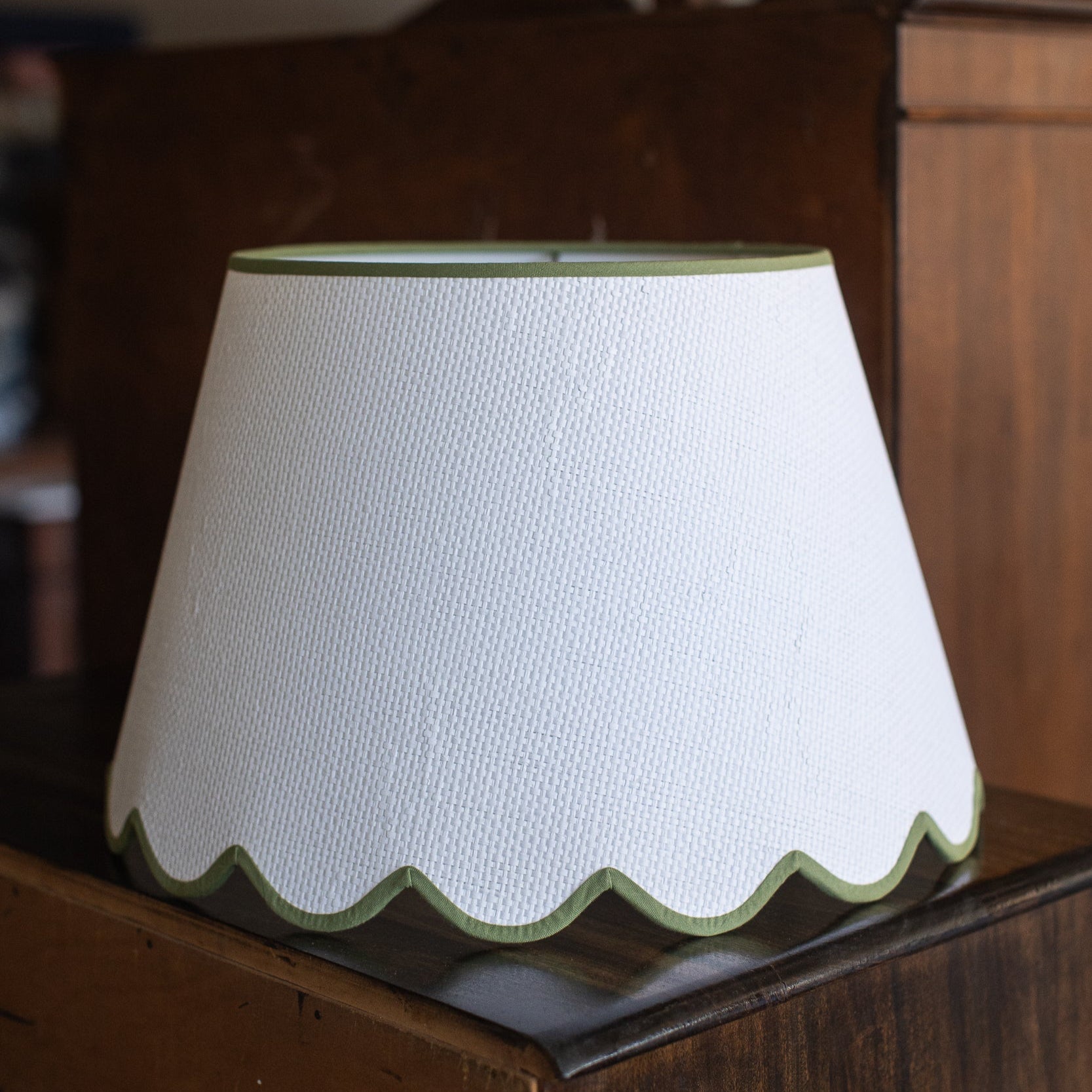 Crisp, tailored, and just a little bit cheeky—this textured waffle weave lampshade gets a playful upgrade with a charming scalloped edge trimmed in soft celadon green. It’s the kind of detail that feels both refined and refreshingly lighthearted, like a wink in a well-set room. A perfect companion to wicker bases, antique brass, or that vintage ceramic lamp you scored years ago. Classic shape, modern charm.