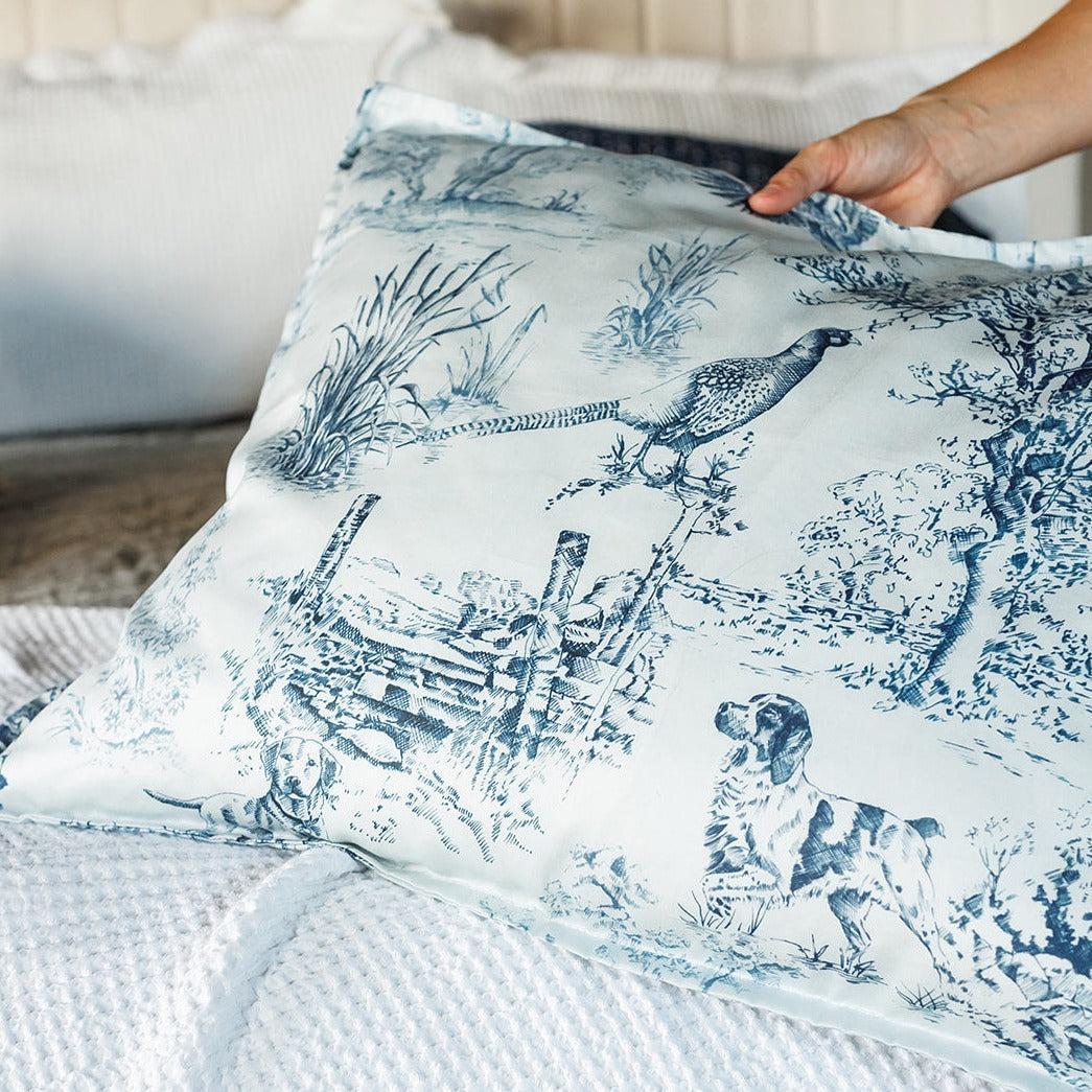 The Sportsman Toile Bedding Collection is perfect for a classic yet modern look. Made with 100% sateen cotton and expertly crafted in America, this blue and white collection is both comfortable and stylish. Enhance your bedroom décor with this timeless set.